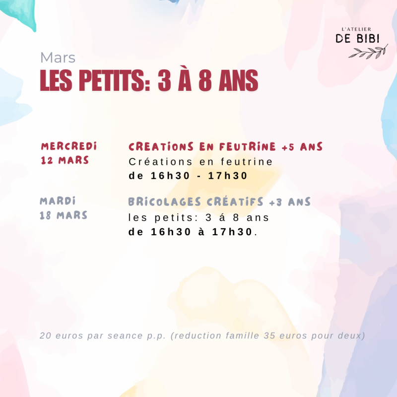 L'atelier est ouvert aux plus petits, de 18 à 36 mois, les lundi 7 et 21 avril. Heure à convenir ensemble.